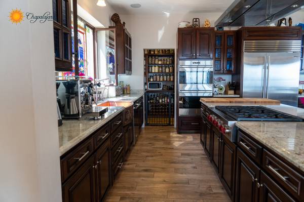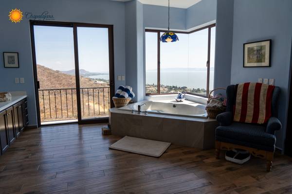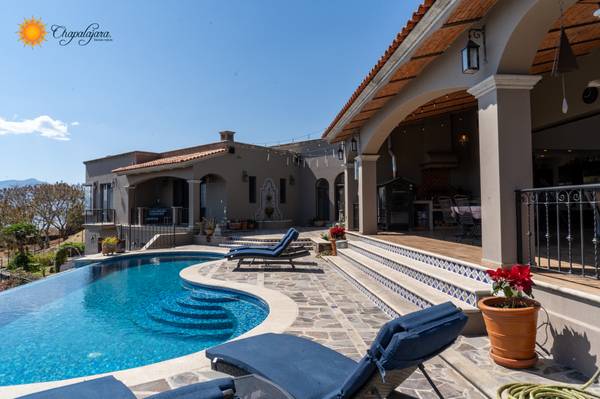 The beautiful entry with an exposed brick boveda ceiling and a magnificent staircase set the tone for the living spaces within, and invites you with a double height ceiling and dramatic views of lake Chapala and the Sierra Madre mountains. Large informal and formal spaces blend for an ideal venue for entertaining both inside and out.