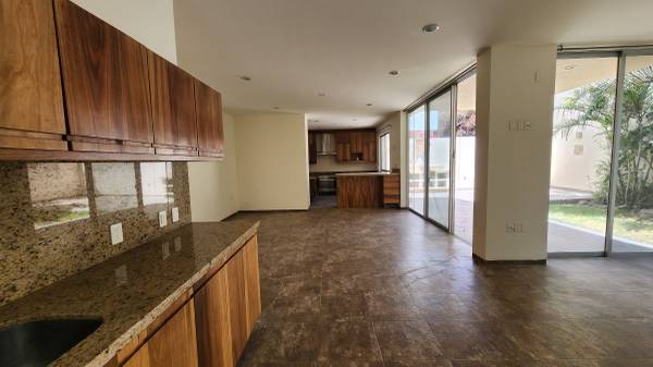 En planta baja: tiene un estudio o cuarto de niños con acceso independiente al jardin, ingreso principal con escalera de doble altura, comedor, sala con bar integrado, cocina integral con madera de parota y cubiertas de granito, alacena amplia. Terraza techada y jardin con asador de carbon.